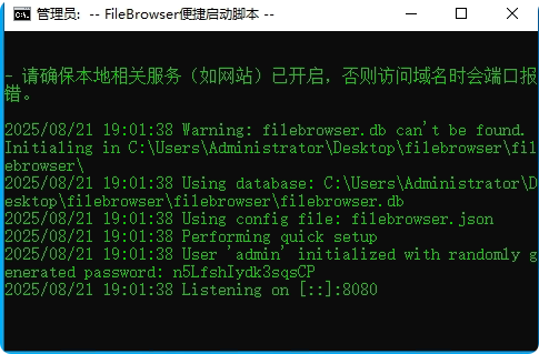 访问 浏览器器访问127.0.0.1:8080后,可以修改密码为自己想要的,确认没有问题后,关掉窗口,再运行cmd按2注册为服务启动